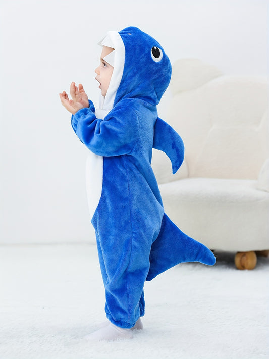 Baby's Shark Hooded Jumpsuit With Tail, Warm Fuzzy Romper
